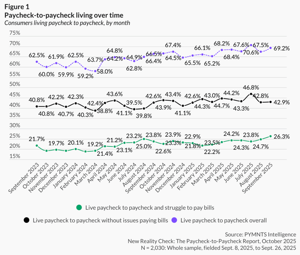 Today, more consumers are struggling to get by. More than one in four, or 26%, had difficulties paying their bills last month—the highest share in at least two years. Overall, nearly seven in 10 consumers are now living paycheck to paycheck, with varying degrees of difficulty in paying monthly bills—the second-highest level over two years and nearly equal to the record high this summer.