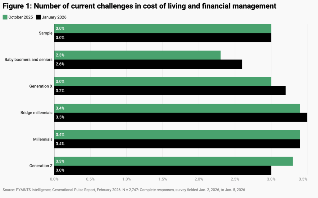 Millennials report an average of 3.4 simultaneous cost pressures, while baby boomers and seniors report 2.6. Financial management for this younger generation increasingly involves juggling multiple bills rather than solving a single problem.